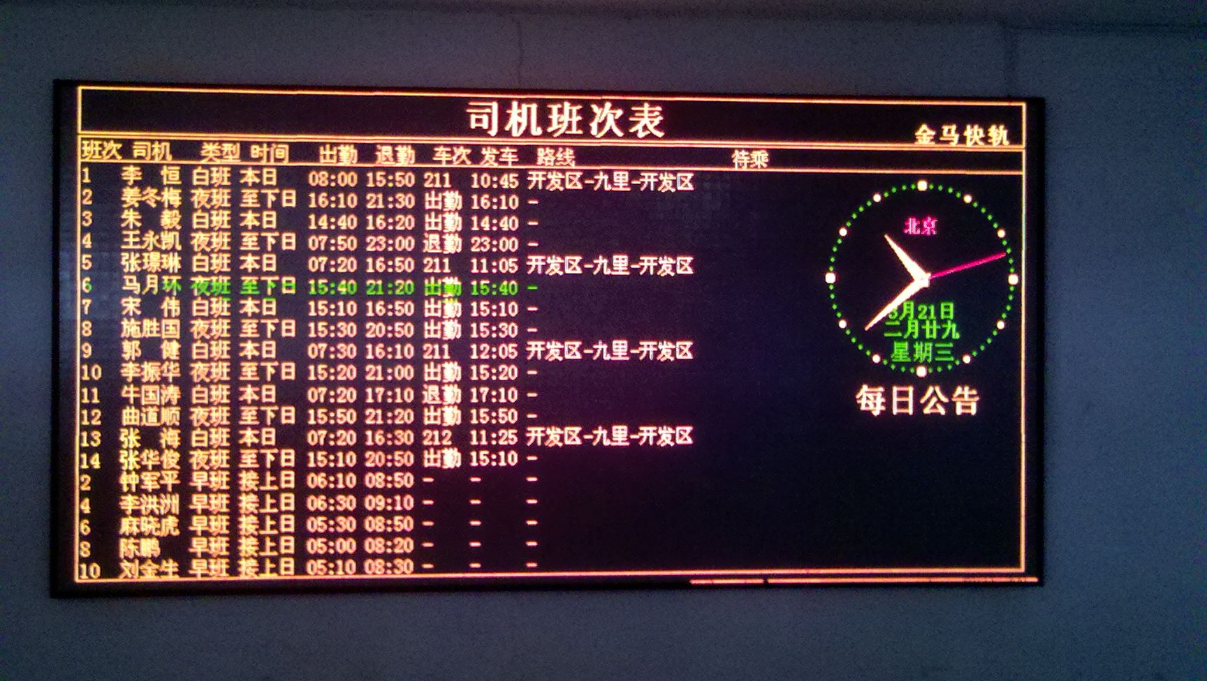 大屏幕及查詢系統(tǒng)滿足地鐵列車運(yùn)營時(shí)刻表和司機(jī)相關(guān)作業(yè)規(guī)定的需要,動(dòng)態(tài)掌握司機(jī)狀況,自動(dòng)生成合理的司機(jī)出乘計(jì)劃,使派班管理員減少重復(fù)勞動(dòng),提高工作效率。同時(shí)避免人為因素出現(xiàn)的計(jì)劃編制差錯(cuò),實(shí)現(xiàn)對司機(jī)的科學(xué)、規(guī)范管理。